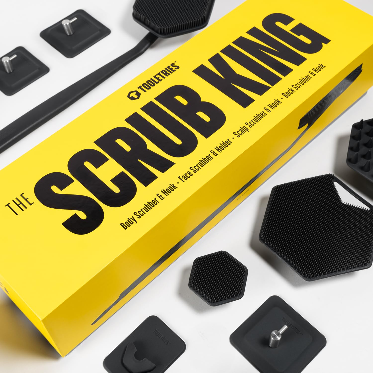 - THE FULL HOUSE: Includes 1 back scrubber, 1 Body Scrubber 2.0, 1 scalp massager, 1 face scrubber and holder, and 3 adhesive hooks that keep everything secure and within reach; compact, easy to store, and travel ready